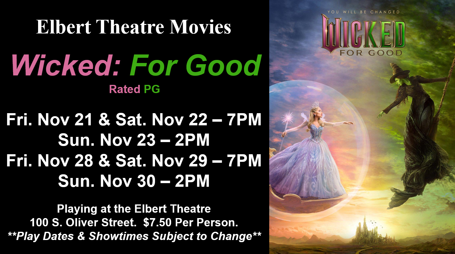 Tickets for Elbert Theatre Movies will not be sold past scheduled movie start times (7:00PM Fri & Sat nights, 2:00PM Sun afternoons).