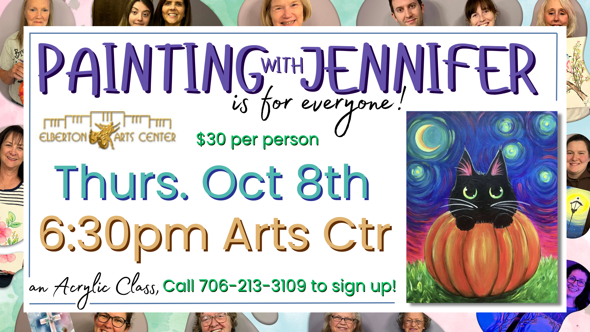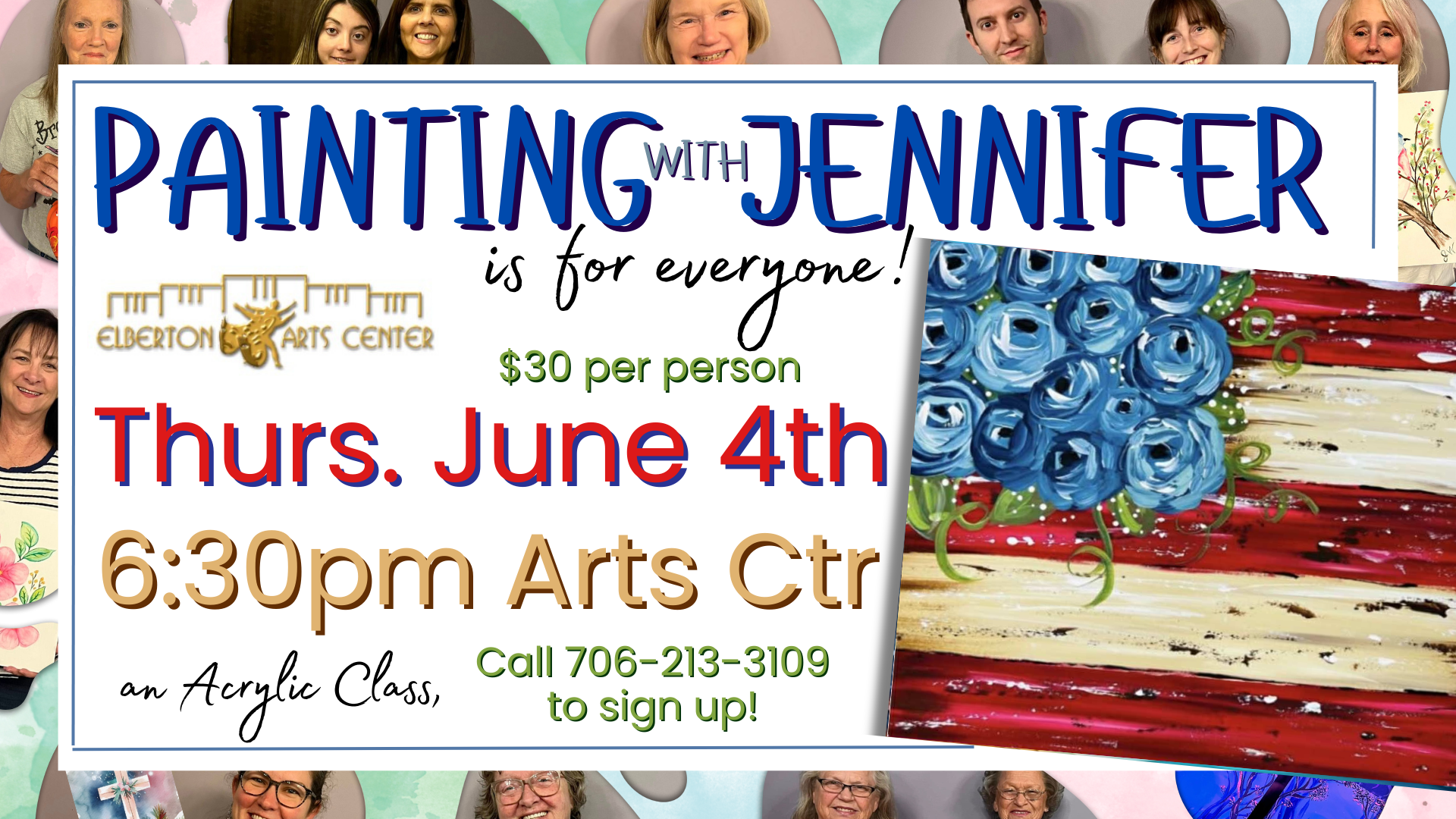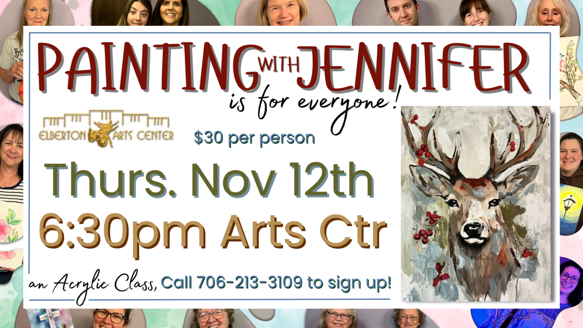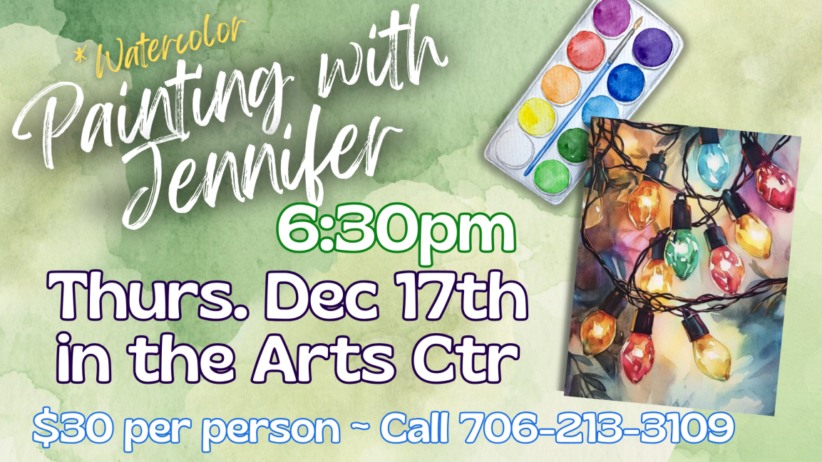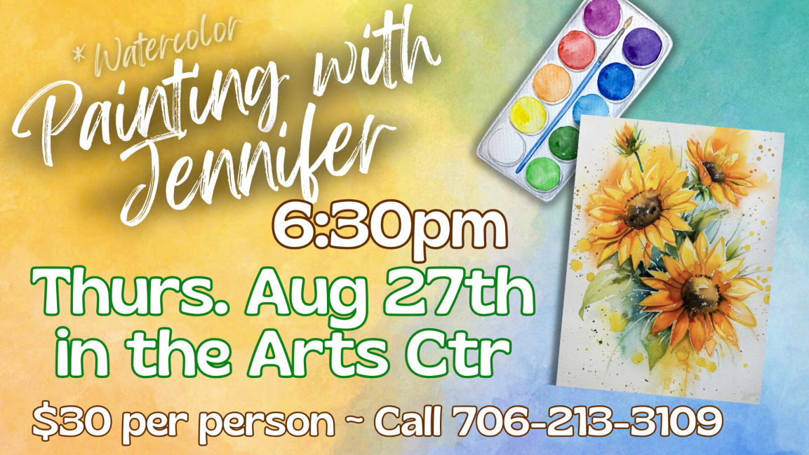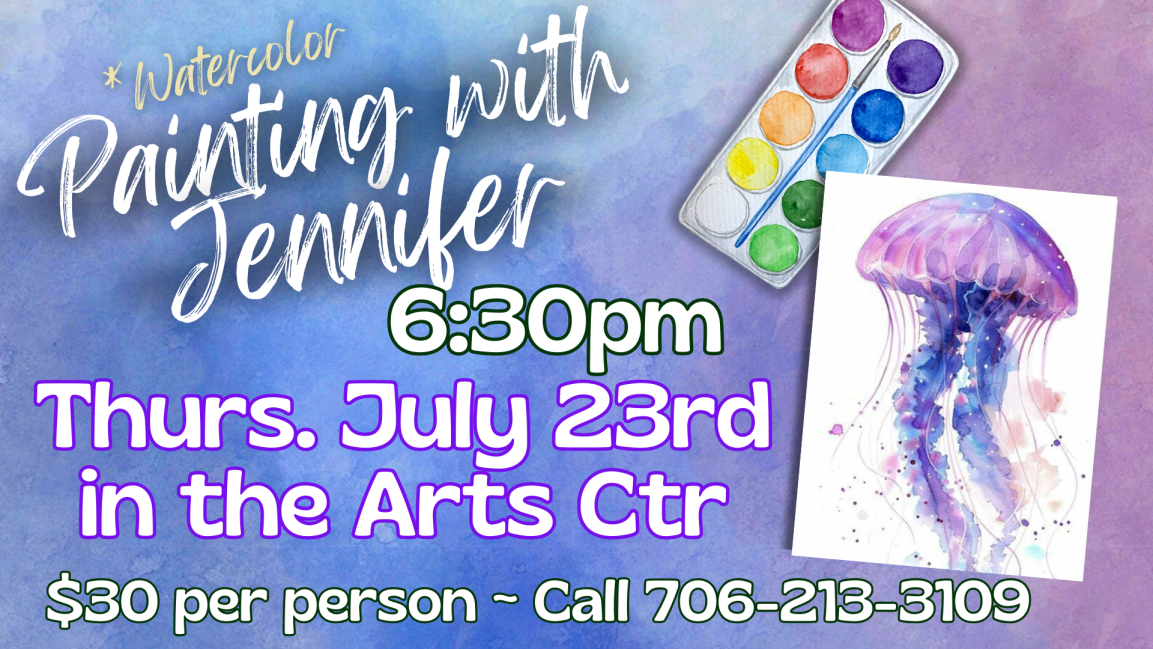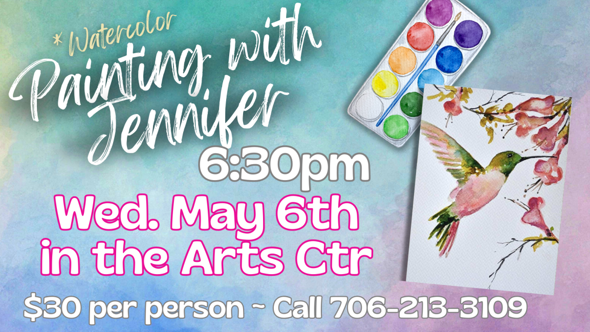 All Painting with Jennifer Classes require non-refundable, non-transferable pre-payment to register for a class. Participants may register in person with check/cash/card or over the phone with credit card. All credit card purchases will be subject to additional fees. 706-213-3109