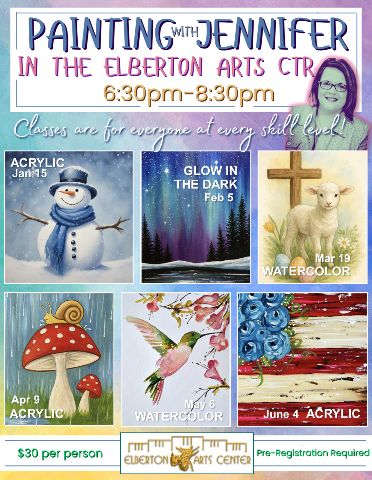 $30 per class.Follow the Elberton Arts Center Facebook Page for class updates and painting selections.